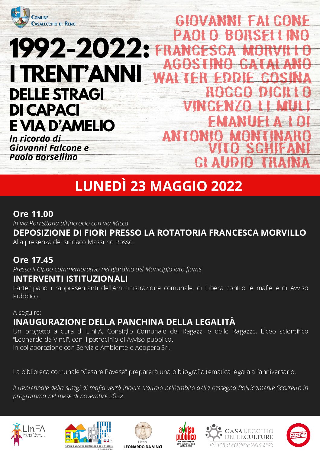 Sono i nomi dei magistrati, delle agenti e degli agenti di scorta uccisi negli attentati mafiosi del 1992 e che il Comune di Casalecchio di Reno ha deciso di ricordare il lunedì 23 maggio, a partire dalle ore 10.00, con una giornata di iniziative dal titolo “1992-2022: i trent’anni dalle stragi di Capaci e via D’Amelio”, in collaborazione con LInFA – Luogo per l’Infanzia, le Famiglie e l’Adolescenza, Consiglio Comunale dei ragazzi e delle ragazze, Liceo Leonardo Da Vinci, Casalecchio delle Culture, Politicamente Scorretto e il patrocinio di Avviso Pubblico.