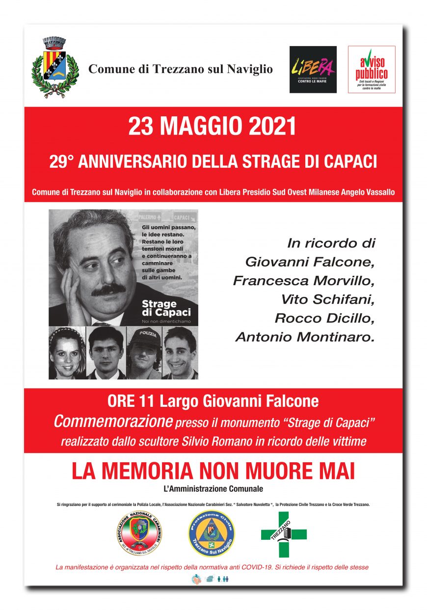 Domenica 23 maggio, alle ore 11.oo, presso il monumento “Strage di Capaci” realizzato dallo scultore Silvio Romano, sito in Largo Giovanni Falcone, a Trezzano sul Naviglio (MI), si terrà la commemorazione per il 29° anniversario dalla strage di Capaci in ricordo di Giovanni Falcone, della moglie Francesca Morvillo e dei ragazzi della scorta Vito Schifani, Rocco Dicillo e Antonio Montinaro.