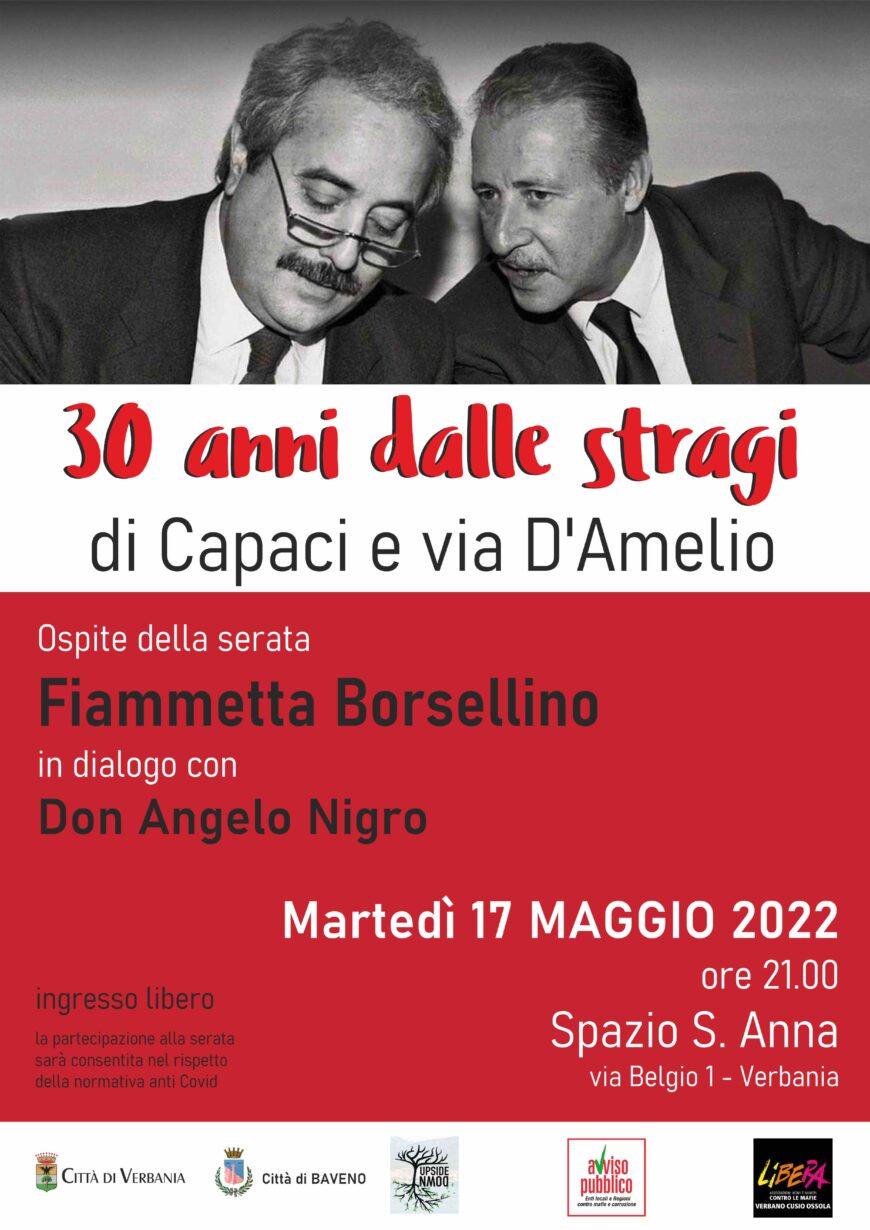 I Comuni di Verbania e Baveno organizzano per martedì 17 maggio alle ore 21.00, presso lo Spazio S.Anna a Verbania in via Belgio 1, l’incontro dal titolo “30 anni dalle stragi di Capaci e via D’Amelio”.