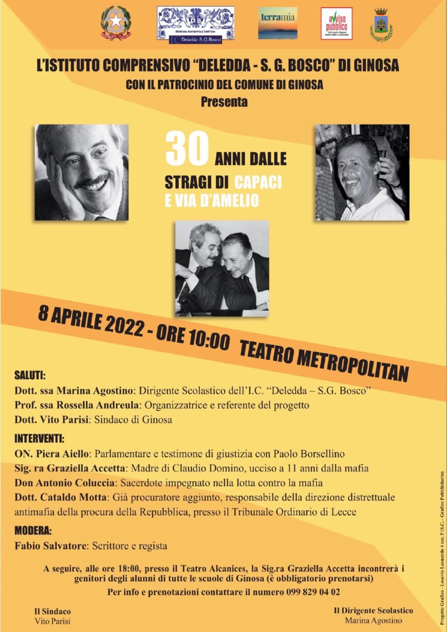 L’Istituto comprensivo “Deledda – S.G.Bosco” di Ginosa (TA), organizza per venerdì 8 aprile alle ore 10,00 al Teatro Metropolitan, un incontro dal titolo “30 anni dalle stragi di Capaci e Via D’Amelio”, col patrocinio del Comune di Ginosa e Avviso Pubblico.