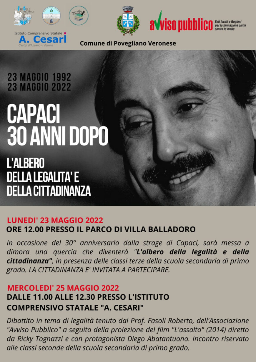 Nell’occasione sarà piantata una quercia in memoria del magistrato ucciso da Cosa nostra il 23 maggio 1992. Gli eventi sono organizzati in collaborazione con Avviso Pubblico, l’Istituto comprensivo statale A.Cesari e la Proloco di Povegliano Veronese. Per Avviso Pubblico partecipa Roberto Fasoli, responsabile del progetto “Amici di Avviso Pubblico”.