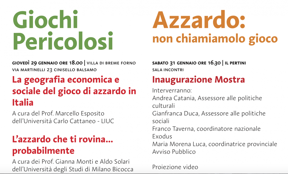 Sabato 31 gennaio, alle ore 16,30, a Cinisello Balsamo, presso la Sala incontri del Pertini, si terrà l’inaugurazione della mostra “Azzardo: non chiamiamolo gioco”, alla quale parteciperà la Coordinatrice provinciale di Avviso Pubblico, Maria Morena Lucà.