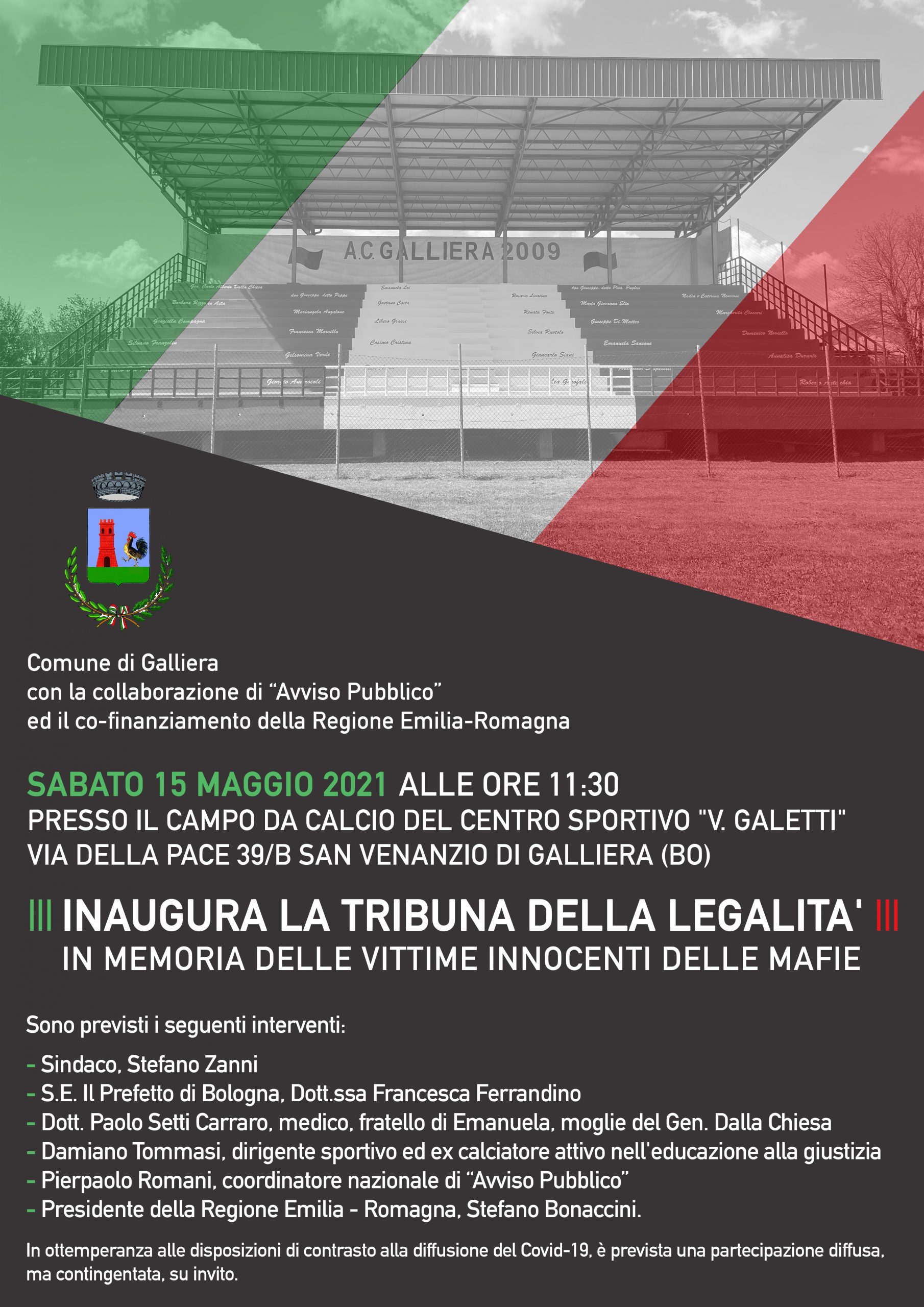 Sabato 15 maggio, a Galliera (Bo), alle ore 11,30, sarà inaugurata la “Tribuna della Legalità” con l’obiettivo di rendere visivamente e permanentemente evidente la memoria di fulgide azioni e straordinari esempi di vita di alcuni di coloro che hanno adempiuto al proprio dovere fino all’estremo sacrificio della vita, ma anche di tante persone che sono state vittime incolpevoli della criminalità, idealmente abbracciandole tutte nel Tricolore che rappresenta lo Stato.