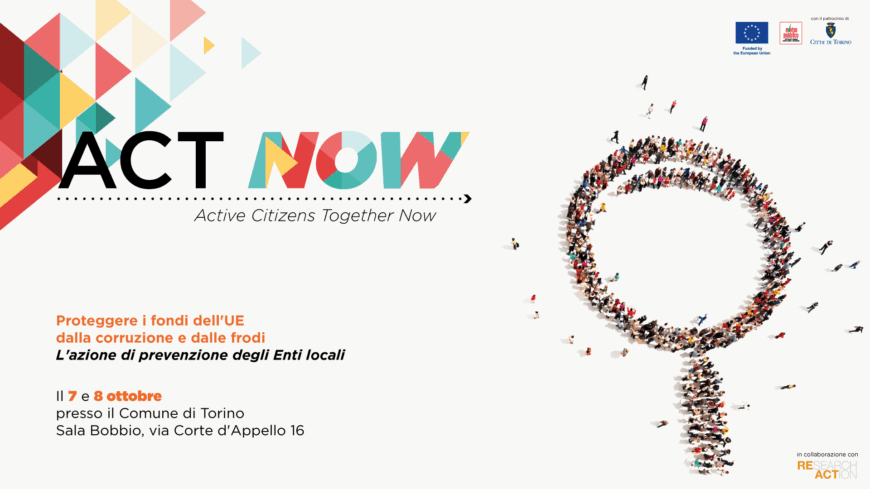Si svolgeranno a Torino, il 7 e 8 ottobre, le prime due giornate formative del progetto ACT NOW – Active Citizens Together Now, finanziato dall’Unione Europea, in particolare dall’Ufficio europeo per la lotta Antifrode (OLAF), e realizzato da Avviso Pubblico in collaborazione con il centro di ricerca RE-ACT.