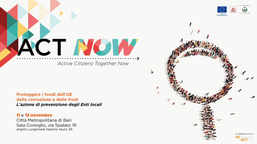 Si svolgerà a Bari, l’11 e il 12 novembre, il secondo appuntamento del progetto formativo ACT NOW – Active Citizens Together Now, finanziato dall’Unione Europea, in particolare dall’Ufficio europeo per la lotta Antifrode (OLAF) e realizzato da Avviso Pubblico con il centro di ricerca RE-ACT e con la collaborazione della Città metropolitana di Bari.