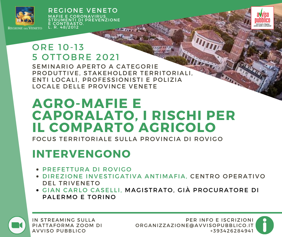 Si svolgerà martedì 5 ottobre, dalle ore 10 alle ore 13, in modalità online, il secondo incontro di formazione aperta, dal titolo “Agro-mafie e caporalato: i rischi per il comparto agricolo. Focus territoriale sulla Provincia di Rovigo”, del progetto “Mafie e Coronavirus, strumenti di prevenzione e contrasto”, promosso dalla Regione del Veneto insieme all’Associazione Avviso Pubblico.