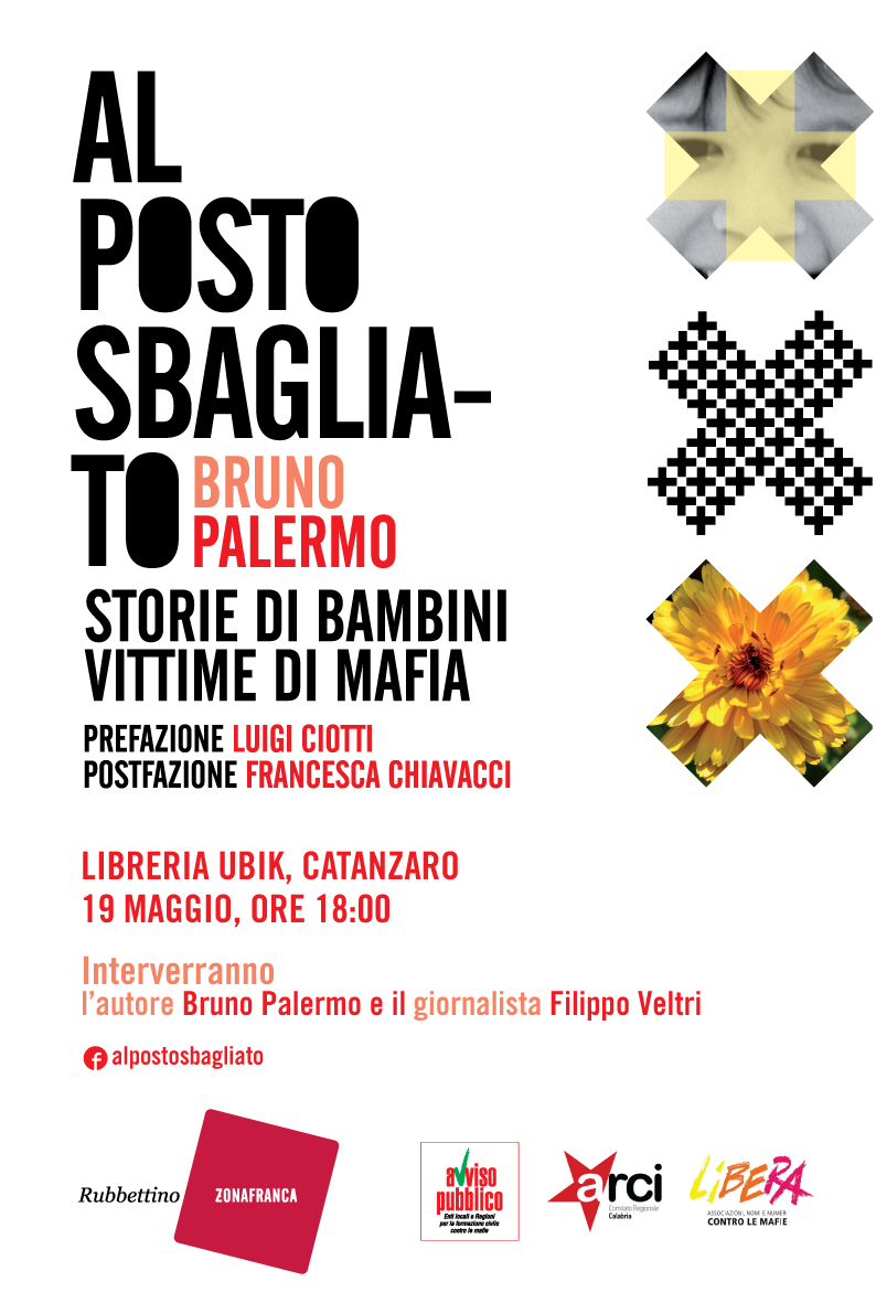 Si svolgerà il 19 maggio a Catanzaro, alle ore 18 presso la libreria Ubik, la presentazione del libro Al posto sbagliato – Storie di bambini vittime di mafia del giornalista Bruno Palermo. L’evento è organizzato da Rubbettino Editore, con il patrocinio di Avviso Pubblico, Arci e Libera. Alla presentazione interverranno l’autore e il giornalista Filippo Veltri.