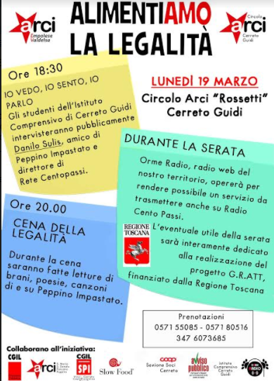 Lunedì 19 marzo l’Arci Empolese Valdelsa organizza in collaborazione anche con Avviso Pubblico una serata dal titolo “Alimentiamo la legalità” con cena dedicata alla legalità al Circolo Arci “L. Rossetti” di Cerreto Guidi, con il coinvolgimento degli studenti dell’Istituto Comprensivo e la partecipazione di Danilo Sulis, direttore siciliano di Rete Cento passi e amico di Peppino Impastato.