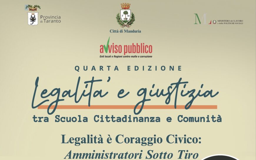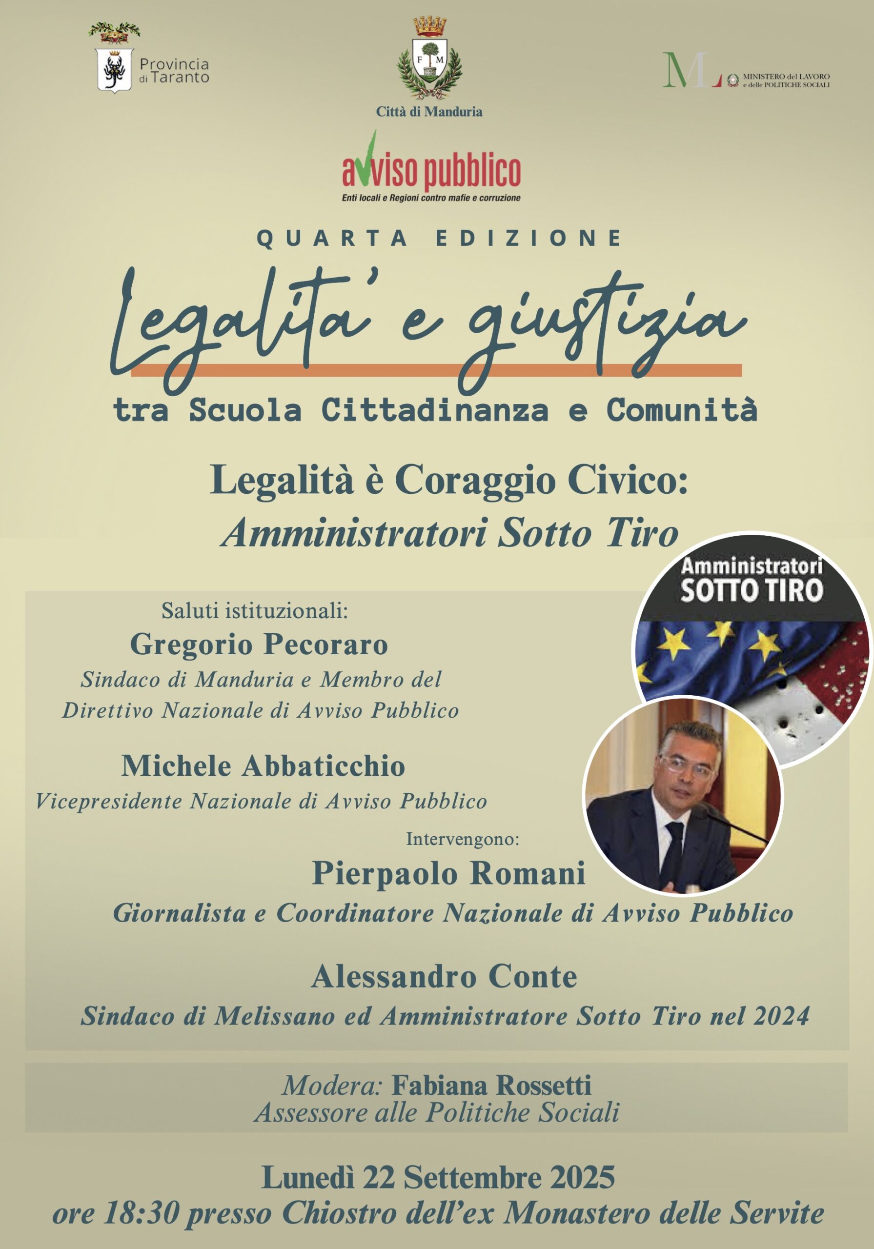 Lunedì 22 Settembre 2025 alle 18.00, il Comune di Manduria organizza il convegno “Amministratori Sotto Tiro: Legalità è Coraggio Civico”.