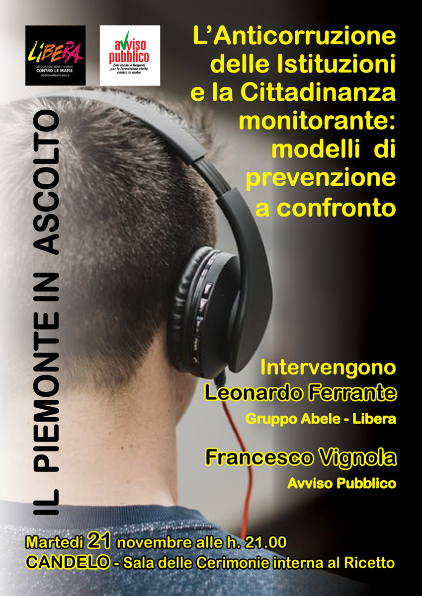 In vista del 9 dicembre, Giornata Internazionale Contro la Corruzione istituita dalla Nazioni Unite nel 2003, Libera ed Avviso Pubblico promuovono una serata di confronto e dibattito sul tema “L’anticorruzione delle istituzioni e la cittadinanza monitorante: modelli di prevenzione a confronto”, che si svolgerà alle ore 21 di martedì 21 novembre a Candelo, presso la Sala delle cerimonie interna al Ricetto.