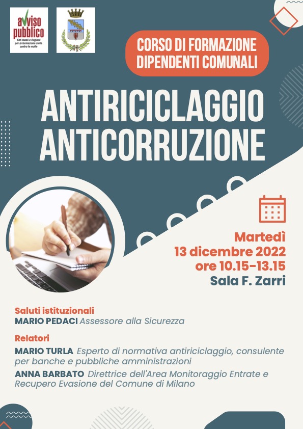 Il Comune di Cento, in collaborazione con Avviso Pubblico, promuove un corso di formazione per i dipendenti comunali dal titolo: “Antiriciclaggio, anticorruzione”.  L’appuntamento è previsto per martedì 13 dicembre dalle 10.15 alle 13.15 presso la Sala F.Zarri.