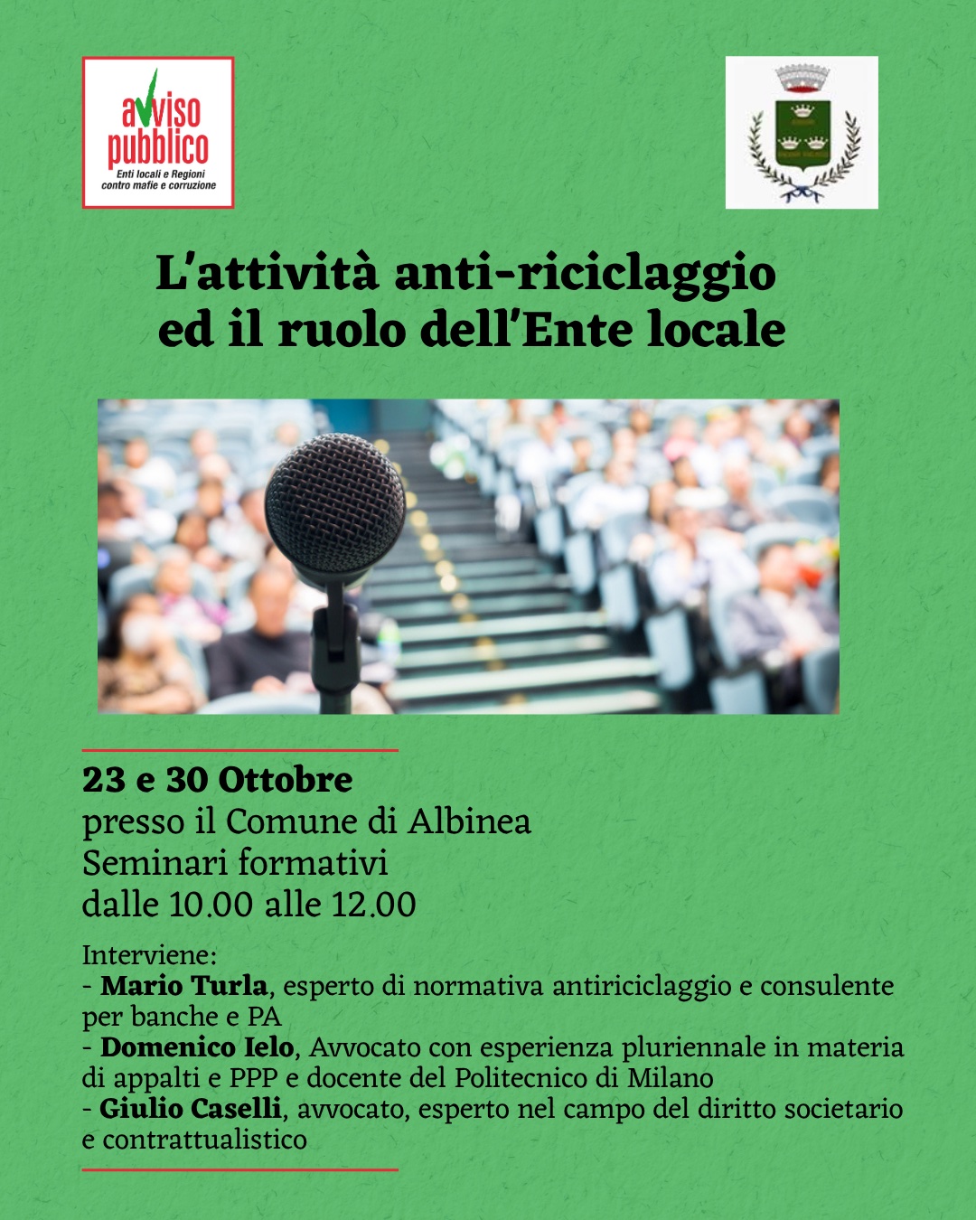 Prosegue, nelle giornate del 6 e del 13 novembre, dalle ore 10 alle 13, la formazione promossa dal Comune di Albinea e da Avviso Pubblico dal titolo “L’attività anti-riciclaggio e il ruolo dell’Ente locale”, con due laboratori a cura del centro di ricerca Re-act.
