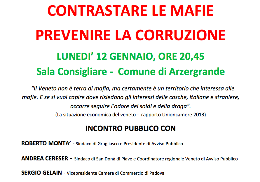 Lunedì 12 Gennaio, alle ore 20,45, presso la Sala Consigliare del Comune di Arzergrande (PD), si terrà un evento pubblico intitolato “Contrastare Le Mafie Prevenire La Corruzione”.