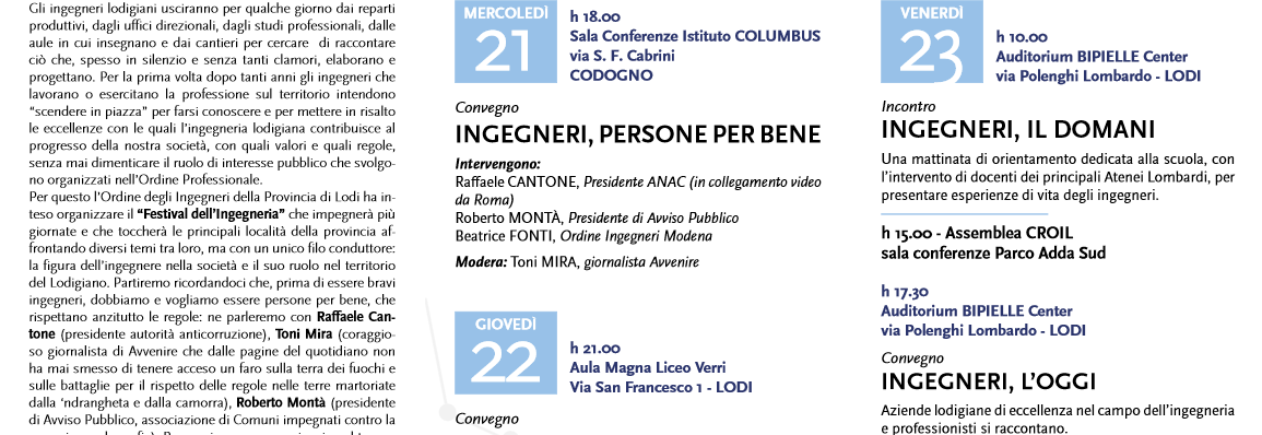 In occasione del 20° Anniversario della costituzione, l’Ordine degli Ingegneri della Provincia di Lodi ha organizzato “Il Festival dell’Ingegneria”, che si svolgerà dal 21 al 24 ottobre 2015, a Lodi, presso Corso Umberto I, 24, per raccontare ciò che, spesso in silenzio e senza tanti clamori, gli ingegneri elaborano e progettano.