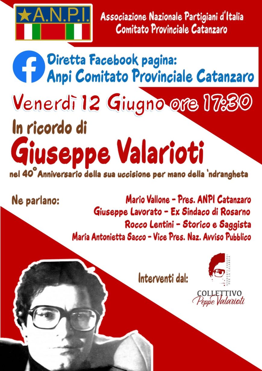 Venerdì 12 giugno, alle ore 17.30, sulla pagina Facebook dell’A.N.P.I. Comitato Provinciale Catanzaro, Avviso Pubblico partecipa alla diretta in ricordo di Giuseppe Valarioti, nel quarantesimo anniversario della sua uccisione per mano della ‘ndrangheta.