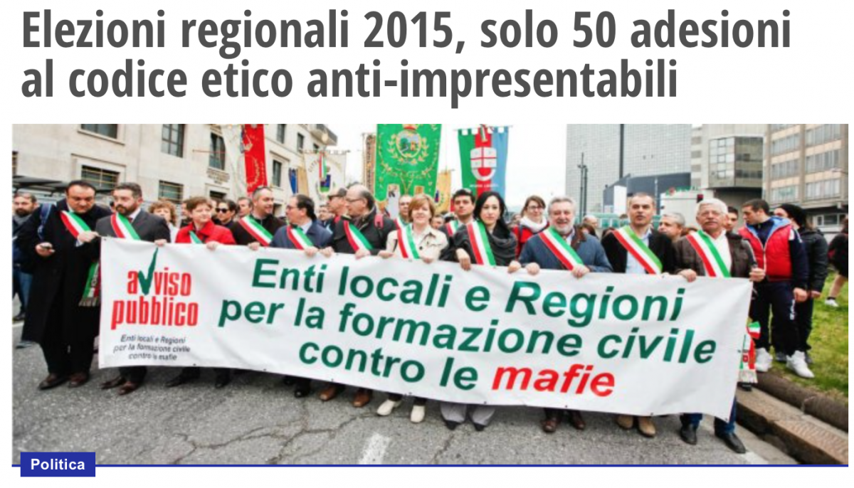 [button size=”medium” link=”http://www.ilfattoquotidiano.it/2015/05/15/elezioni-regionali-2015-solo-50-adesioni-al-codice-etico-anti-impresentabili/1686294/” type=”wide” linking=”new-window”]Scarica l’articolo de Il Fatto quotidiano[/button] [button size=”medium” link=”https://www.avvisopubblico.it/home/progetti/progetti-in-corso/carta-di-avviso-pubblico/” type=”wide” linking=”new-window”]Vedi chi ha sottoscritto la Carta di Avviso Pubblico[/button]
