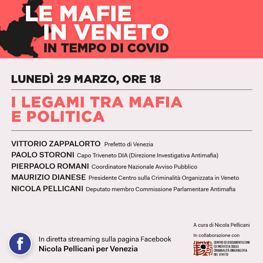 Lunedì 29 marzo, alle ore 18,00, il Coordinatore nazionale di Avviso Pubblico, Pierpaolo Romani, parteciperà all’incontro intitolato “I legami tra mafia e politica”, nell’ambito della rassegna “Le mafie in Veneto in tempo di Covid”, organizzata dall’On. Nicola Pellicani, componente della Commissione parlamentare antimafia.