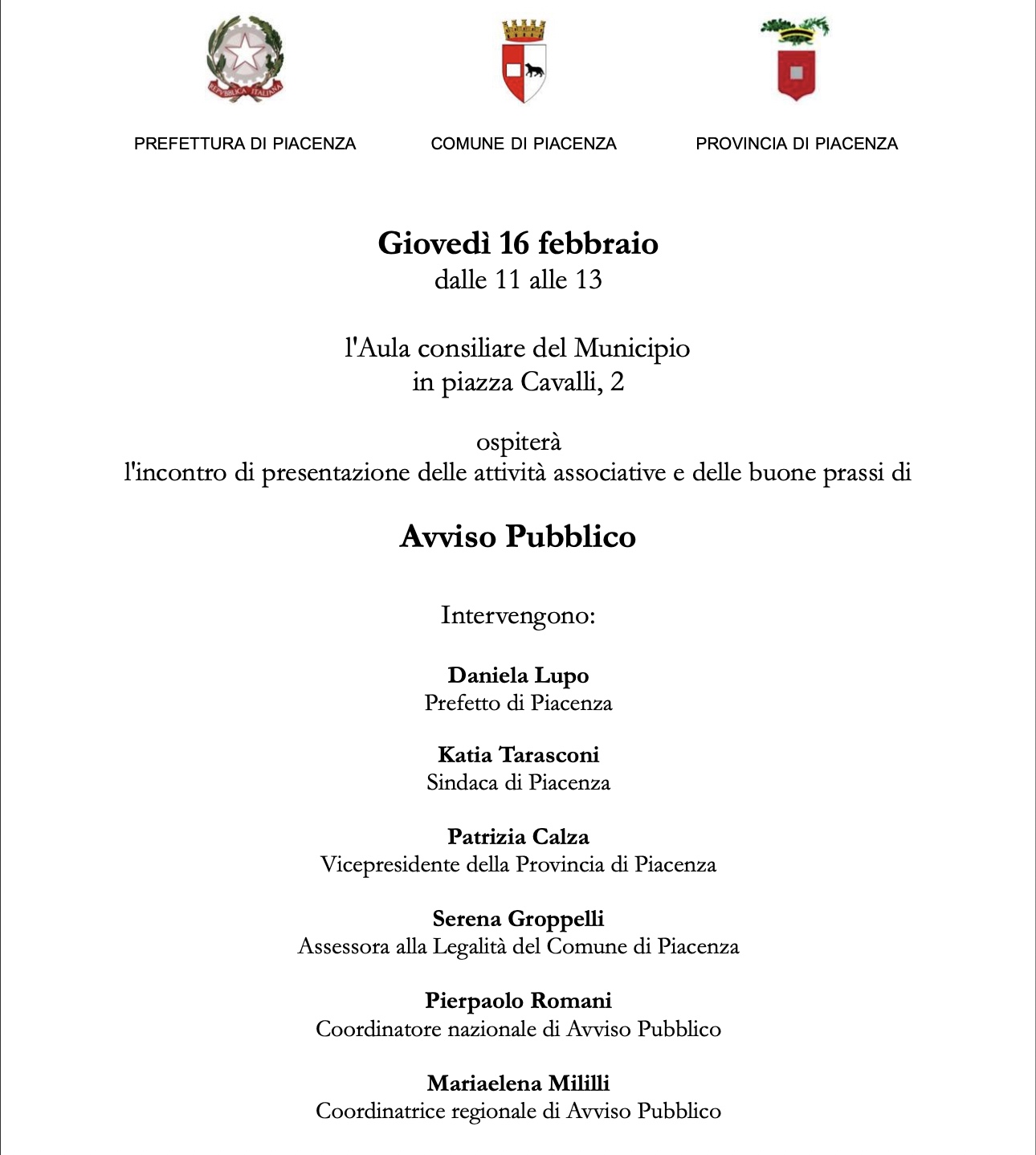 Il Comune di Piacenza, in collaborazione con la Provincia di Piacenza e la Prefettura di Piacenza organizzano per giovedì 16 febbraio dalle 11.00 alle 13.00, presso l’Aula consiliare del Municipio in piazza Cavalli 2, l’incontro di presentazione delle attività associative e delle buone prassi di Avviso Pubblico.