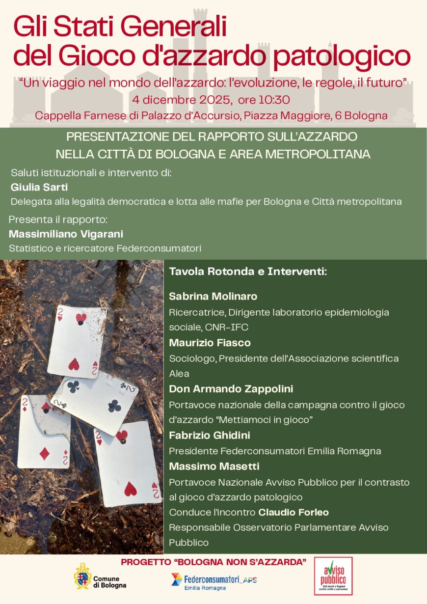 La giornata, dal titolo “Un viaggio nel mondo dell’azzardo: l’evoluzione, le regole, il futuro”, rivolta alla cittadinanza tutta, si aprirà con la presentazione dei dati del rapporto di Federconsumatori Emilia Romagna APS sull’azzardo legale nell’area metropolitana di Bologna e vedrà gli interventi di: