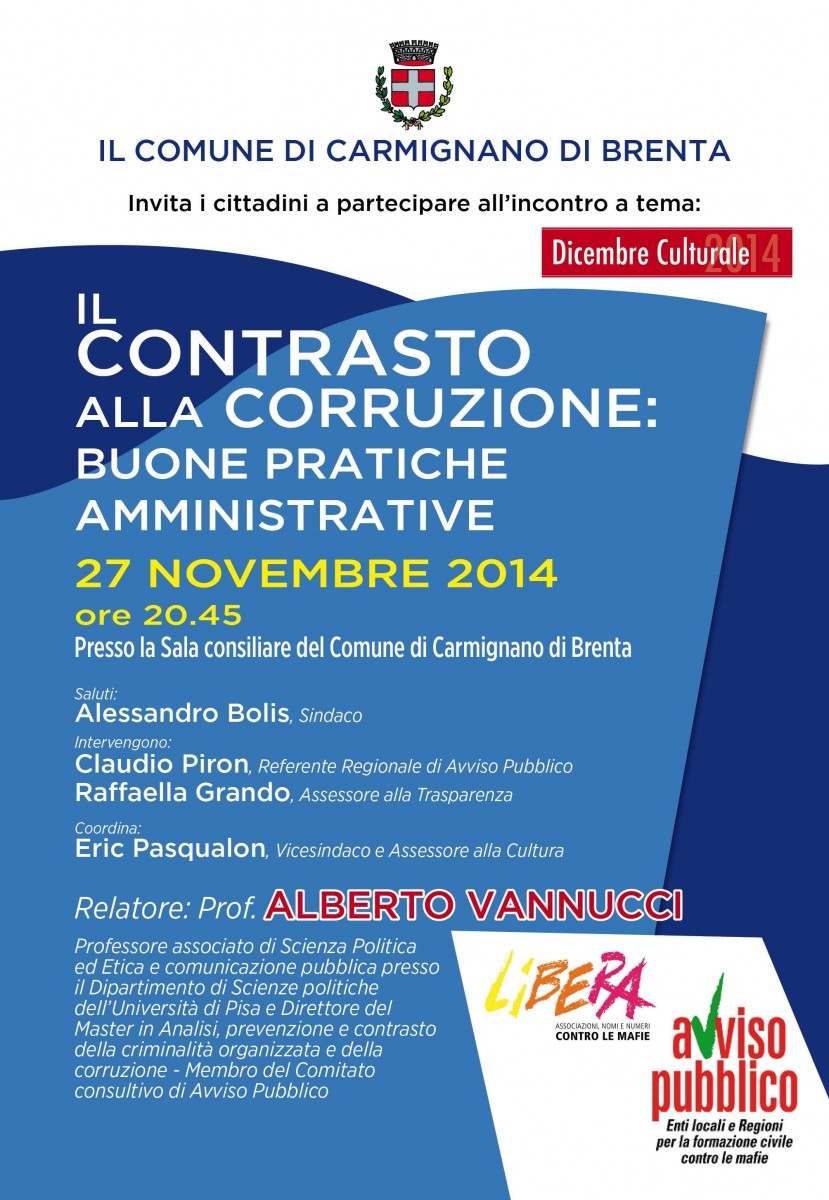 Giovedì 27 novembre, alle ore 20.45, presso la Sala Consiliare del Comune di Carmignano di Brenta (PD), si terrà un incontro pubblico sul tema “Il contrasto alla corruzione. Buone pratiche amministrative”. Dopo i saluti del Sindaco, AlessandroBolis, interverranno Claudio Piron, Referente regionale di Avviso Pubblico e Raffaella Grando, Assessore alla Trasparenza. Coordina Eric Pasqualon, Vicesindaco e Assessore alla Cultura.