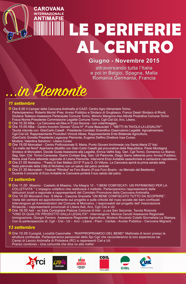 La Carovana Internazionale Antimafie, organizzata da Arci, Libera, Avviso Pubblico, insieme ai sindacati (Cgil, Cisl e Uil) sarà in Piemonte l’11, 12 e 13 settembre, con visite a Courgnè alla villa confiscata al boss Bruno Iaria, alla Cascina Graziella confiscata a Moncalvo in provincia di Asti, al Castello di Miasino, dove i cancelli verranno aperti per un incontro tra la delegazione della carovana e gli amministratori locali e in tante altre località.