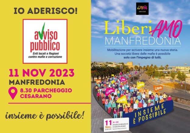 Ci sarà anche Avviso Pubblico alla mobilitazione “LiberiAMO Manfredonia” che attraverserà le strade della città per dire no alle mafie e ad ogni forma di […]Leggi tutto “Io aderisco”, l’11 novembre Avviso Pubblico al corteo “LiberiAMO Manfredonia”