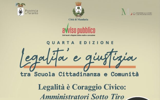 Lunedì 22 Settembre 2025 alle 18.00, il Comune di Manduria organizza il convegno “Amministratori Sotto Tiro: Legalità è Coraggio Civico”. L’evento si svolgerà presso il Chiostro […]Leggi tutto Amministratori Sotto Tiro, il 22 settembre a Manduria il convegno “Legalità è Coraggio Civico”