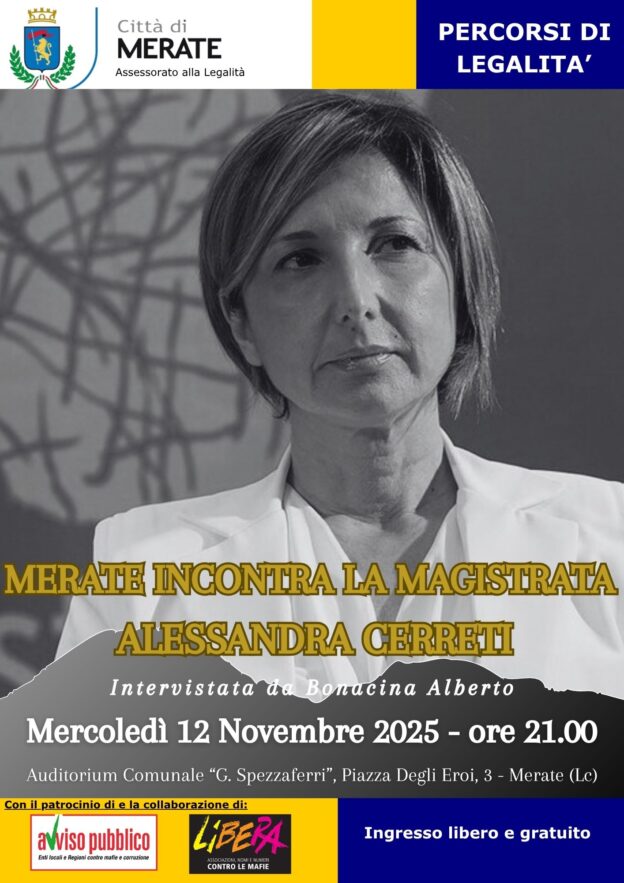Mercoledì 12 novembre, dalle 21:00 alle 23:00, l’Assessorato alla Legalità del Comune di Merate organizza il convegno “Merate incontra la magistrata Alessandra Cerreti”. L’evento si svolgerà […]Leggi tutto Il 12 novembre Merate incontra la magistrata Alessandra Cerreti