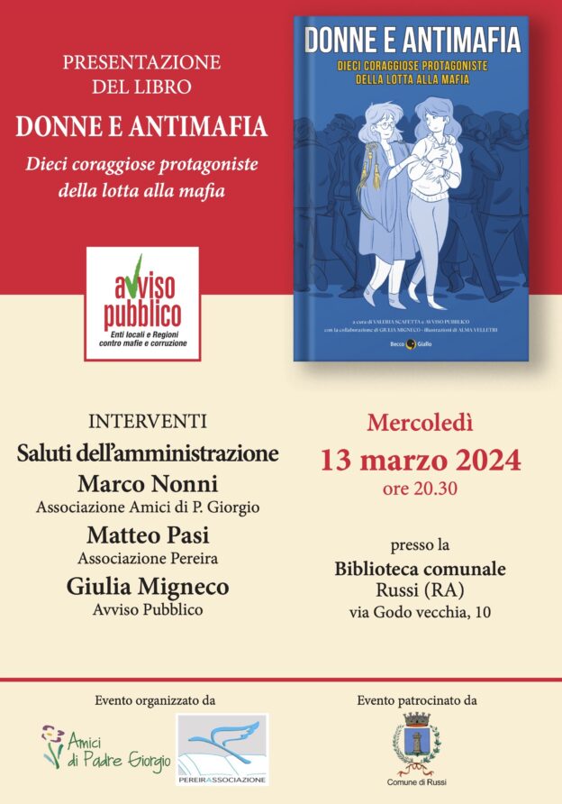 Le Associazioni “Amici di Padre Giorgio” e “Pereira”, organizzano per mercoledì 13 marzo alle 20.30, presso la Biblioteca comunale di Russi, in provincia di Ravenna, la […]Leggi tutto “Donne e antimafia”: il 13 marzo a Russi la presentazione della graphic novel di Avviso Pubblico