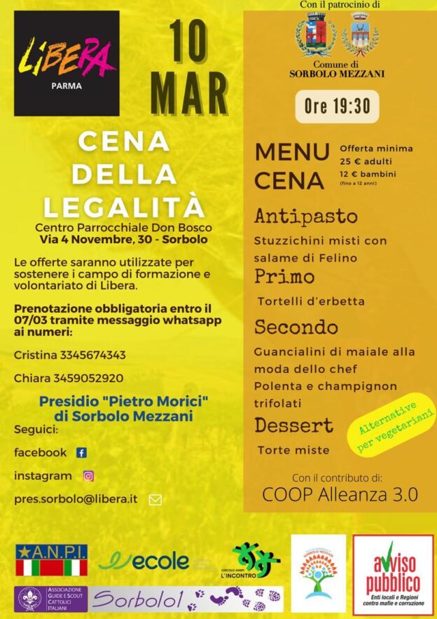 L’appuntamento è domenica 10 marzo, dalle 19.30 alle 23.00, presso Centro Parrocchiale Don Bosco, Via IV novembre, 30 a Sorbolo Mezzani in provincia di Parma. […]Leggi tutto Il 10 marzo la “Cena della Legalità” del Comune di Sorbolo Mezzani e Libera