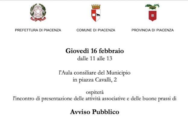 Il Comune di Piacenza, in collaborazione con la Provincia di Piacenza e la Prefettura di Piacenza organizzano per giovedì 16 febbraio dalle 11.00 alle 13.00, […]Leggi tutto AVVISO PUBBLICO PRESENTA LE PROPRIE ATTIVITÀ E PROGETTI: IL 16 FEBBRAIO L’INCONTRO A PIACENZA