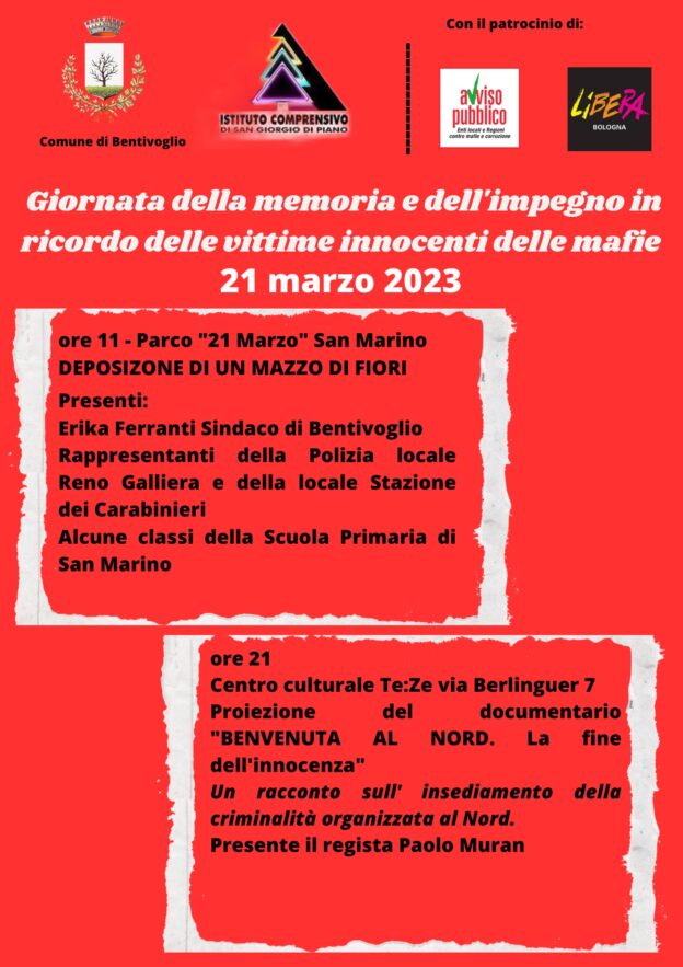 Per 28° Giornata della Memoria e dell’Impegno in ricordo delle vittime innocenti delle mafie, il Comune di Bentivoglio, Bologna, organizza per martedì 21 marzo due […]Leggi tutto IN MEMORIA DELLE VITTIME DI MAFIA: IL 21 MARZO LE INIZIATIVE DEL COMUNE DI BENTIVOGLIO (BO)