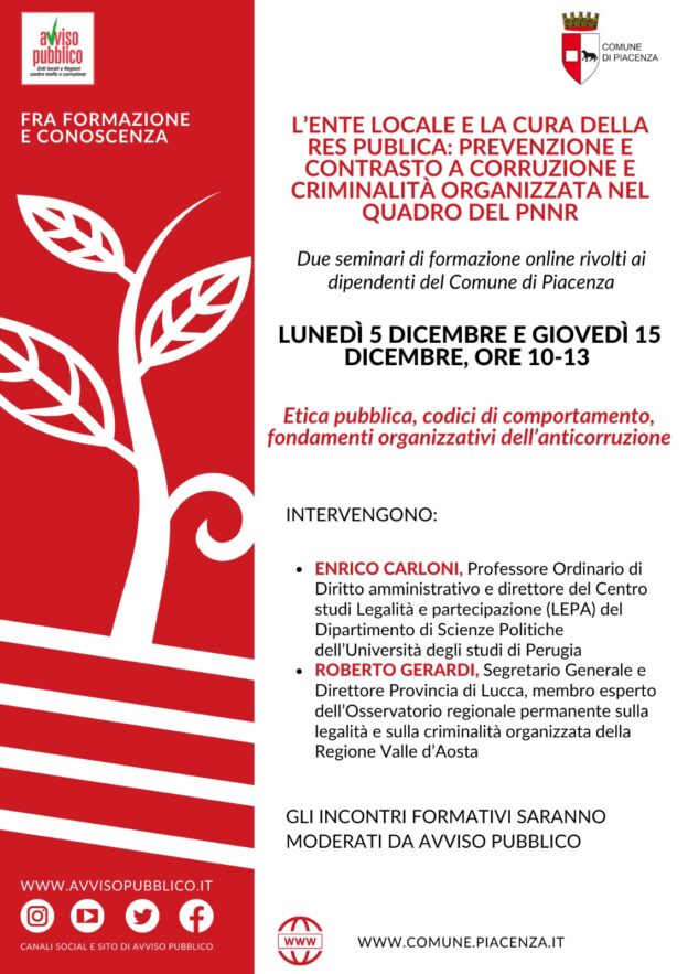 Il Comune di Piacenza promuove due seminari di formazione online dedicati ai dipendenti dell’Ente, previsti per lunedì 5 e giovedì 15 dicembre dalle 10.00 alle […]Leggi tutto PNRR E CONTRASTO A CRIMINALITÀ ORGANIZZATA E CORRUZIONE, TRA FORMAZIONE E CONOSCENZA: IL 5 E IL 15 DICEMBRE, A PIACENZA, DUE SEMINARI CON AVVISO PUBBLICO