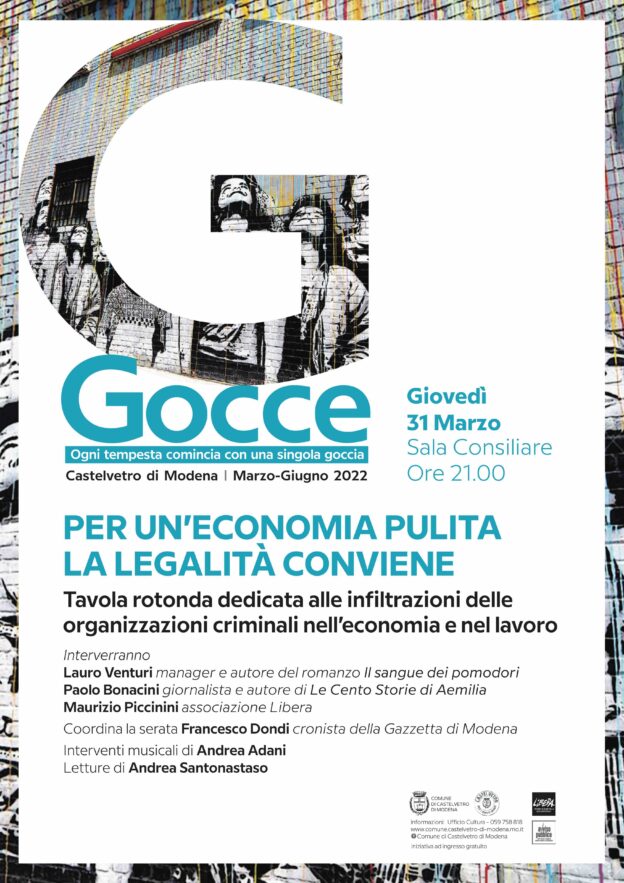 Si apre il 31 marzo alle 21, presso la Sala Consiliare del Comune di Castelvetro di Modena la tavola rotonda dedicata alle infiltrazioni delle organizzazioni […]Leggi tutto “GOCCE PER UN’ECONOMIA PULITA”: IL 31 MARZO UNA TAVOLA ROTONDA A CASTELVETRO DI MODENA