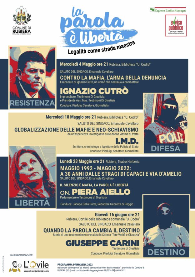 LA PAROLA È LIBERTÀ: DAL 4 MAGGIO AL 16 GIUGNO LA RASSEGNA SULLA LEGALITÀ DEL COMUNE DI RUBIERA (RE)