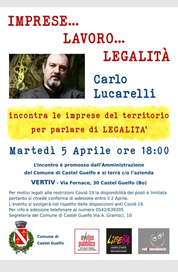 L’appuntamento con Carlo Lucarelli è previsto per martedì 5 aprile, alle ore 18,00, presso l’azienda Vertiv, in via Fornace 30, a Castel Guelfo (Bologna), con l’incontro […]Leggi tutto IMPRESE, LAVORO, LEGALITÀ: IL 5 APRILE, A CASTEL GUELFO, UN INCONTRO CON CARLO LUCARELLI