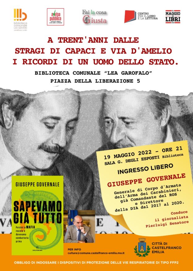 Il Comune di Castelfranco Emilia ha organizzato per giovedì 19 maggio alle 21.00, presso la Biblioteca comunale “Lea Garofalo”, in piazza della Liberazione 5, la […]Leggi tutto A 30 ANNI DALLE STRAGI DEL ’92, IL RICORDO DI UN UOMO DELLO STATO: IL 19 MAGGIO, A CASTELFRANCO EMILIA, L’INCONTRO CON IL GENERALE GOVERNALE