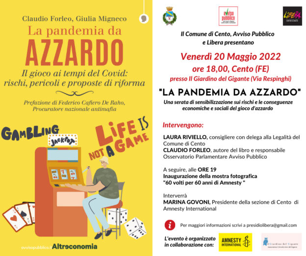 Il Comune di Cento, Avviso Pubblico e Libera hanno organizzato una serata di confronto sul tema del gioco d’azzardo, con la presentazione del libro di Avviso Pubblico […]Leggi tutto “LA PANDEMIA DA AZZARDO”: IL 20 MAGGIO AVVISO PUBBLICO A CENTO PRESENTA IL LIBRO SUL GIOCO D’AZZARDO