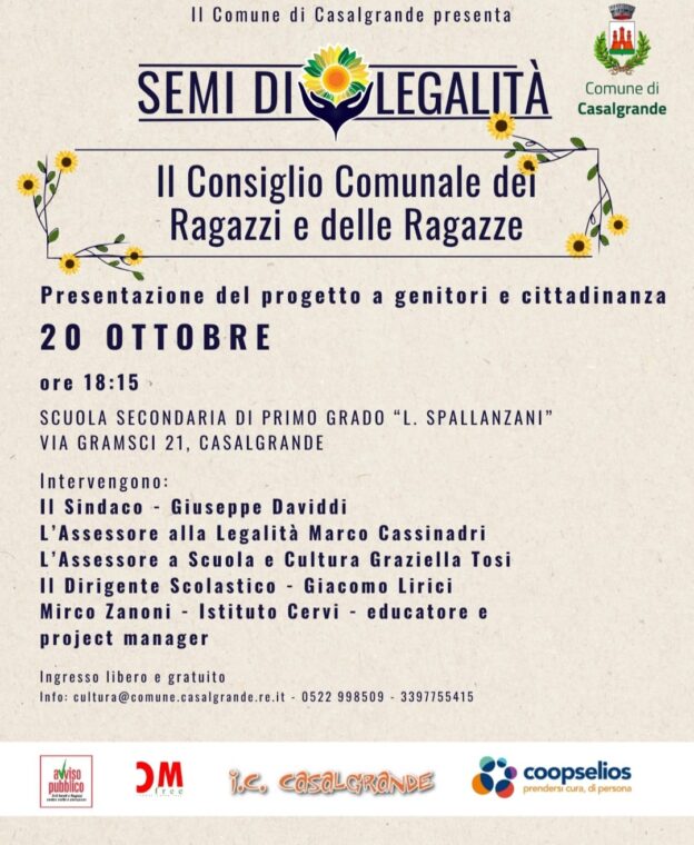 Nell’ambito del progetto “Semi di legalià”, lunedì 20 ottobre, dalle 18:00 alle 19:00, a Casalgrande (Reggio Emilia) si riunisce “Il Consiglio Comunale dei Ragazzi e delle […]Leggi tutto Il 20 ottobre a Casalgrande si riunisce il Consiglio Comunale dei Ragazzi e delle Ragazze