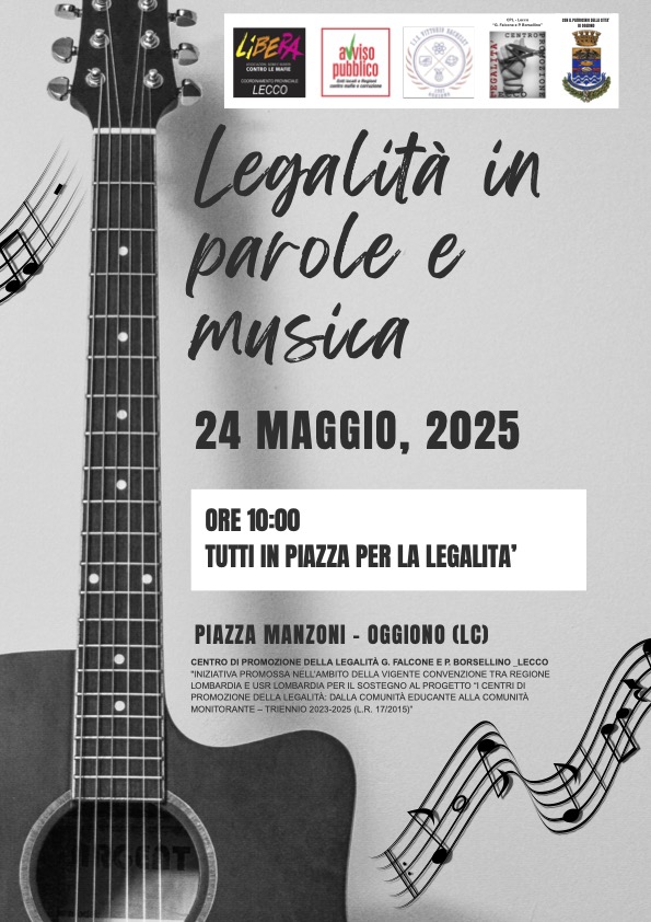 Il 24 Maggio 2025, dalle 10:00 alle 13:00, a Oggiono in provincia di LC, l’Istituto Vittorio Bachelet Oggiono – Scuola Capofila CPL “G. Falcone e […]Leggi tutto Il 24 maggio a Oggiono l’evento “Legalità in parole e musica”