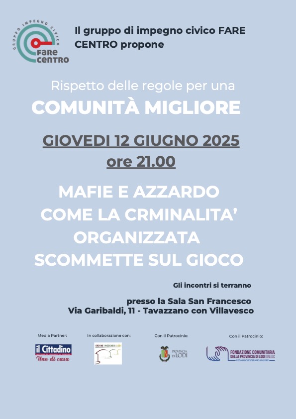 Mafie e azzardo, il 12 giugno a Tavazzano con Villavesco Avviso Pubblico all’incontro di “Fare Centro”
