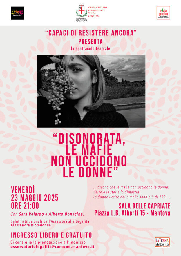 In occasione della Giornata della Legalità, il 23 maggio 2025, dalle 21:00 il Comune di Mantova, nell’ambito della rassegna “Capaci di resistere ancora”, promuovelo spettacolo […]Leggi tutto “Capaci di resistere ancora”, il 23 maggio a Mantova lo spettacolo teatrale “Disonorata, le mafie non uccidono le donne”
