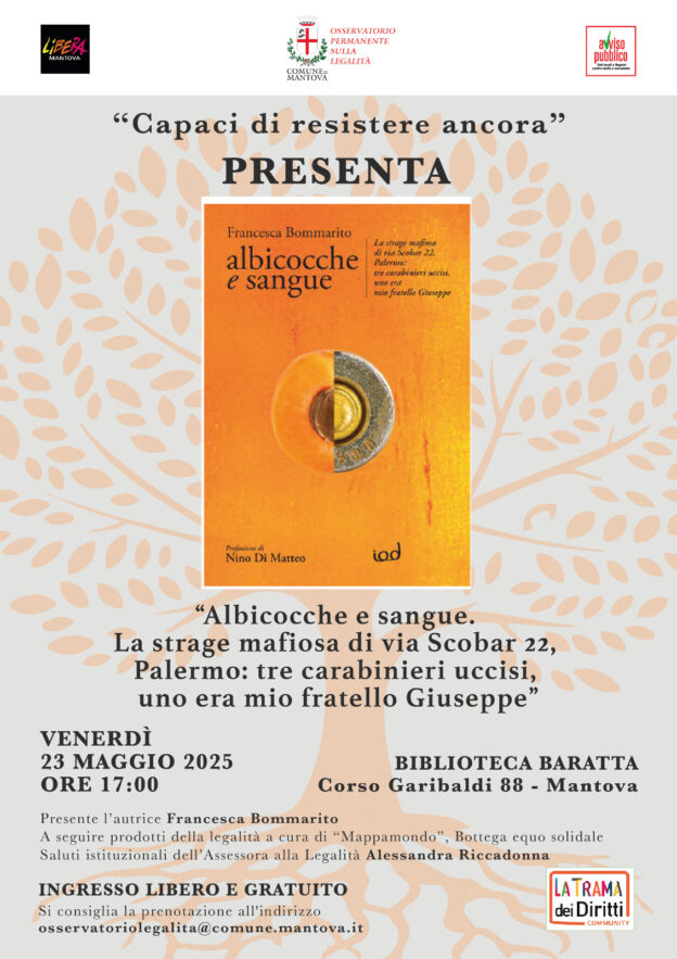 Il 23 Maggio 2025, dalle 17:00 il Comune di Mantova organizza la presentazione del libro “Albicocche e sangue. La strage mafiosa di Via Scobar 22, Palermo: […]Leggi tutto Il 23 maggio a Mantova la presentazione del libro “Albicocche e sangue”