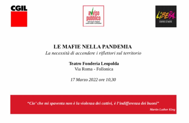 LE MAFIE NELLA PANDEMIA: IL 17 MARZO, A FOLLONICA, AVVISO PUBBLICO PARTECIPA ALLA TAVOLA ROTONDA CON LA CGIL E LIBERA