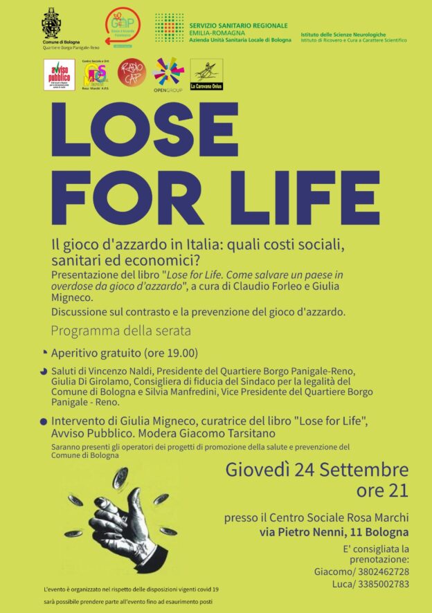 Giovedì 24 settembre, a Bologna, alle ore 21.00 presso il Centro Sociale Rosa Marchi, situato in Via Pietro Nenni 11, si svolgerà la presentazione del […]Leggi tutto Il 24 settembre a Bologna Avviso Pubblico presenta il suo libro “Lose for life. Come salvare un paese in overdose da gioco d’azzardo”