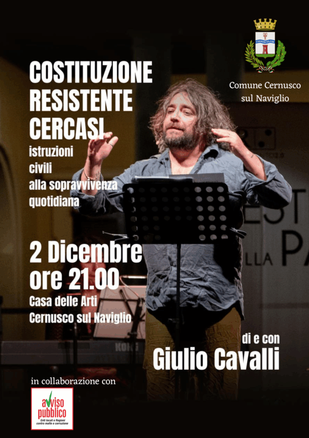 Tra gli appuntamenti della rassegna natalizia promossa dal Comune di Cernusco sul Naviglio in collaborazione con Avviso Pubblico spazio anche per la riflessione sull’attualità. Il […]Leggi tutto Costituzione Resistente Cercasi: il 2 dicembre, a Cernusco sul Naviglio (Mi), l’evento con Giulio Cavalli per riflettere sull’attualità
