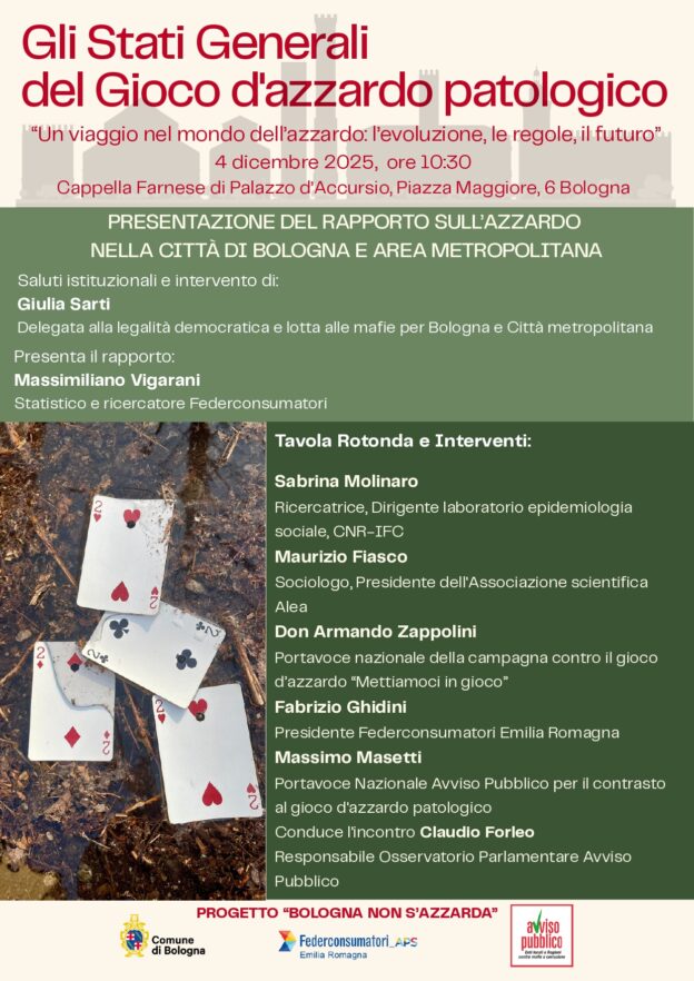 Il 4 dicembre, dalle 10:30 alle 13:30, presso la Cappella Farnese di Palazzo d’Accursio (Piazza Maggiore, 6) di Bologna si svolgeranno Gli Stati Generali del […]Leggi tutto “Bologna non s’azzarda”: il 4 dicembre, a Bologna, gli Stati Generali del Gioco d’azzardo patologico