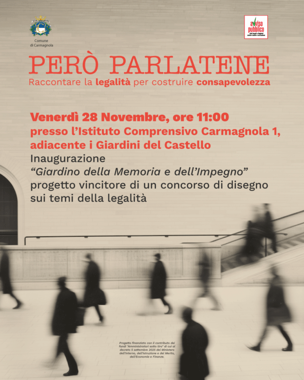 Venerdì 28 novembre, alle ore 11:00, presso l’Istituto Comprensivo Carmagnola 1, si terrà la cerimonia di inaugurazione del Giardino della Memoria e dell’Impegno, uno spazio […]Leggi tutto Inaugurazione del “Giardino della Memoria e dell’Impegno” a Carmagnola, il 28 novembre, per la rassegna “Però Parlatene. Raccontare la legalità per costruire consapevolezza”