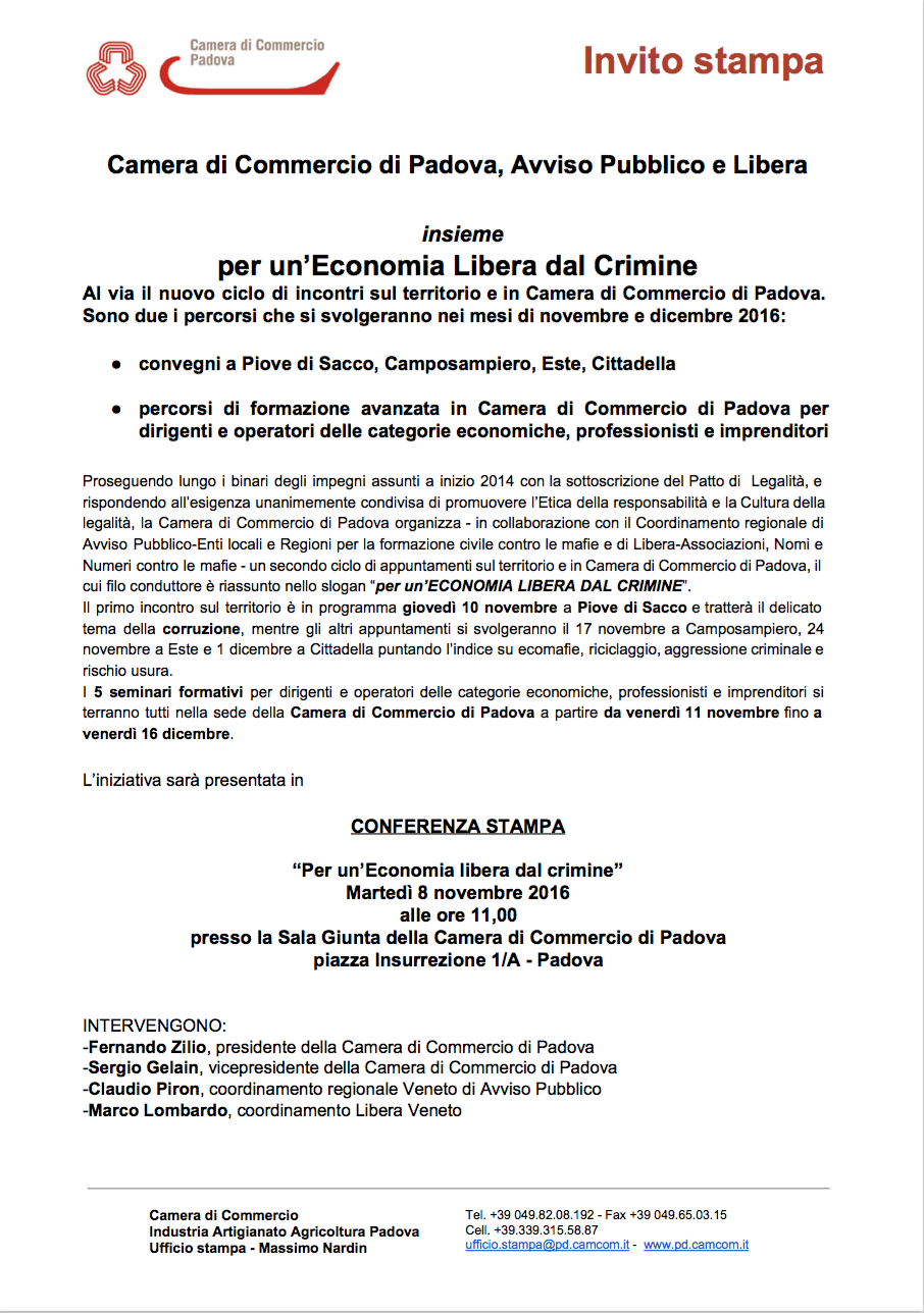 Si svolgerà martedì 8 novembre 2016, alle ore 11, presso la Camera di Commercio di Padova, la conferenza stampa di presentazione del nuovo ciclo di incontri sul territorio provinciale padovano e dei seminari formativi per dirigenti e rappresentanti delle Associazioni di categoria… […]Leggi tutto Per un’Economia Libera dal Crimine: Padova, 8 novembre, presentazione del nuovo ciclo di incontri e seminari di alta formazione