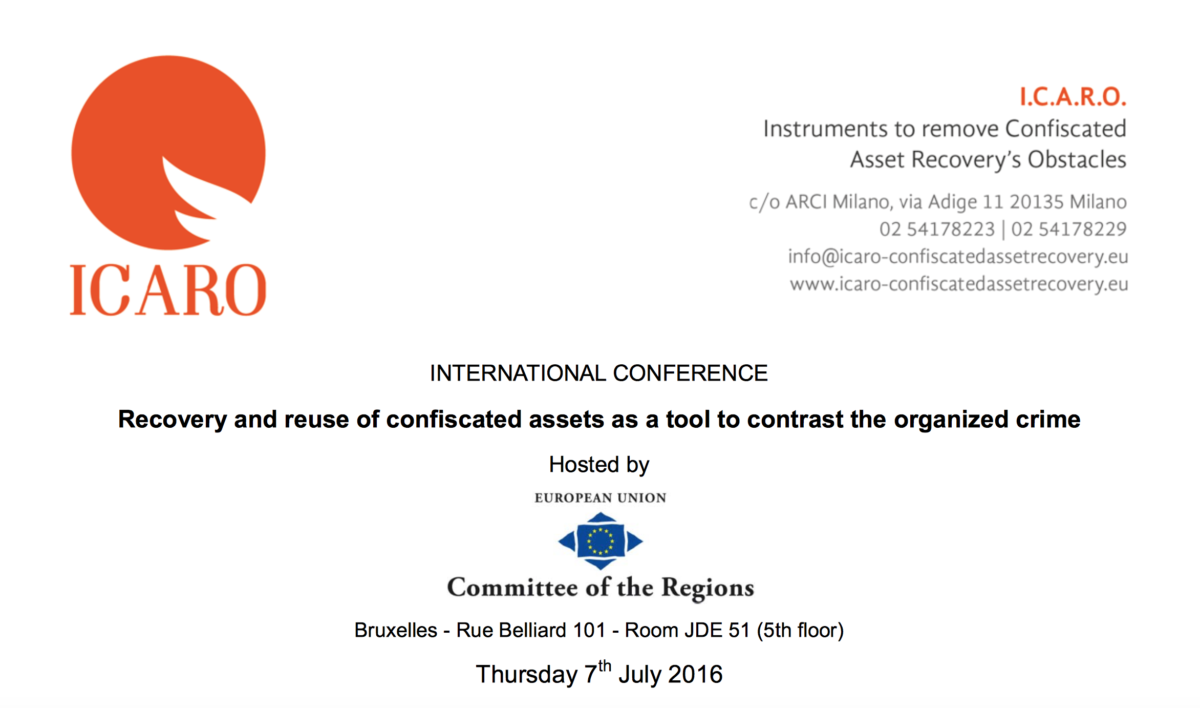 Si terrà a Bruxelles giovedì 7 luglio, a partire dalle ore 8.45 presso il Comitato delle Regioni del Parlamento europeo (Rue Belliard 101, Stanza JDE 51, 5° piano) la Conferenza conclusiva del Progetto ICARO su “Il risanamento e il riutilizzo sociale dei beni e delle aziende confiscate come strumento di contrasto al crimine organizzato”.